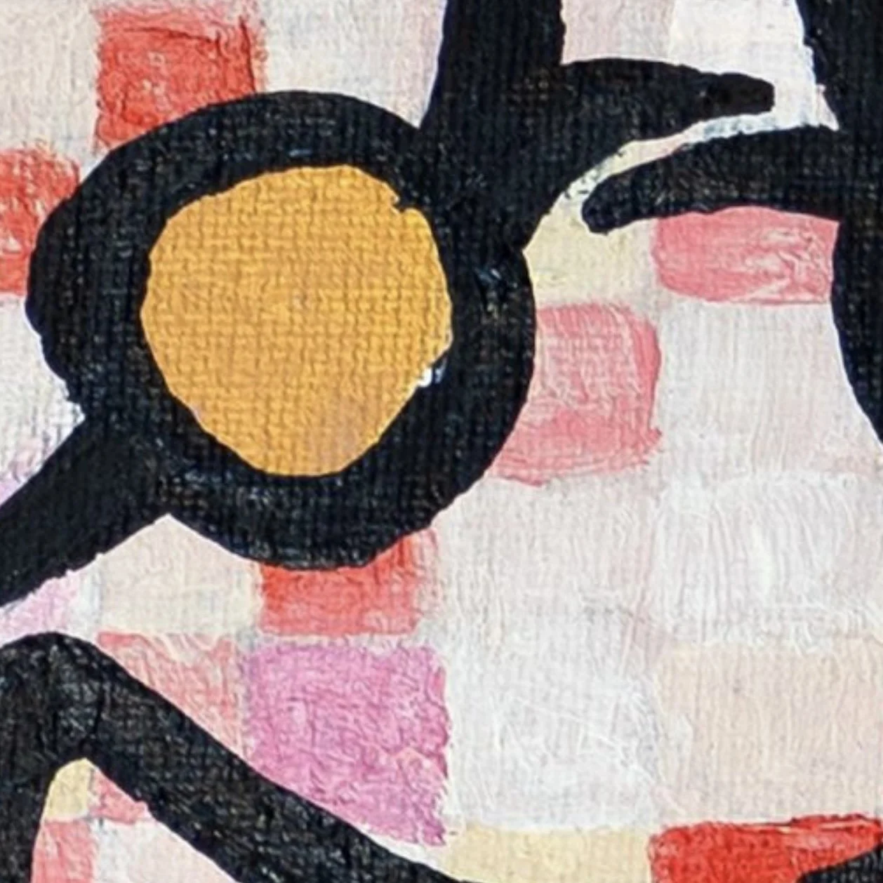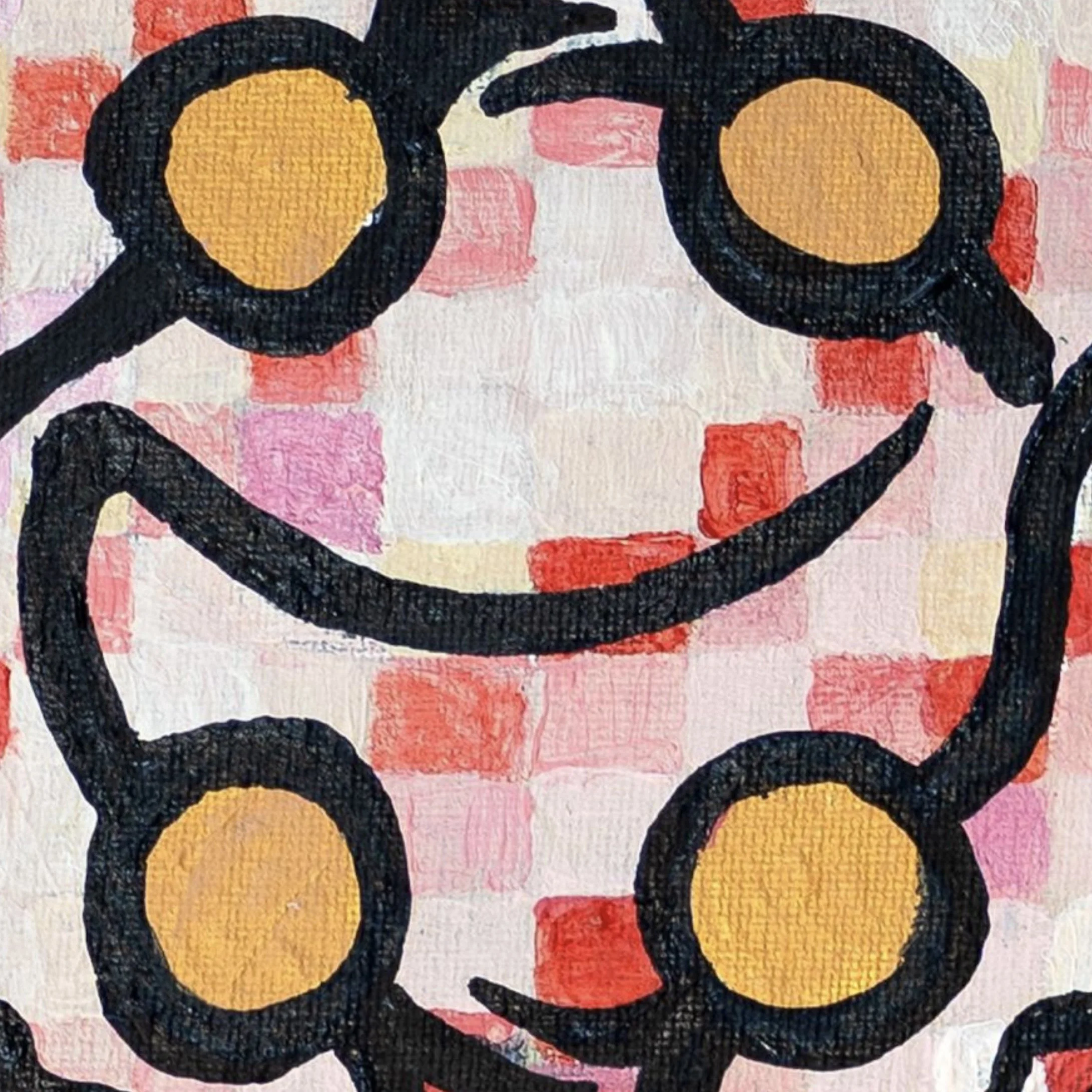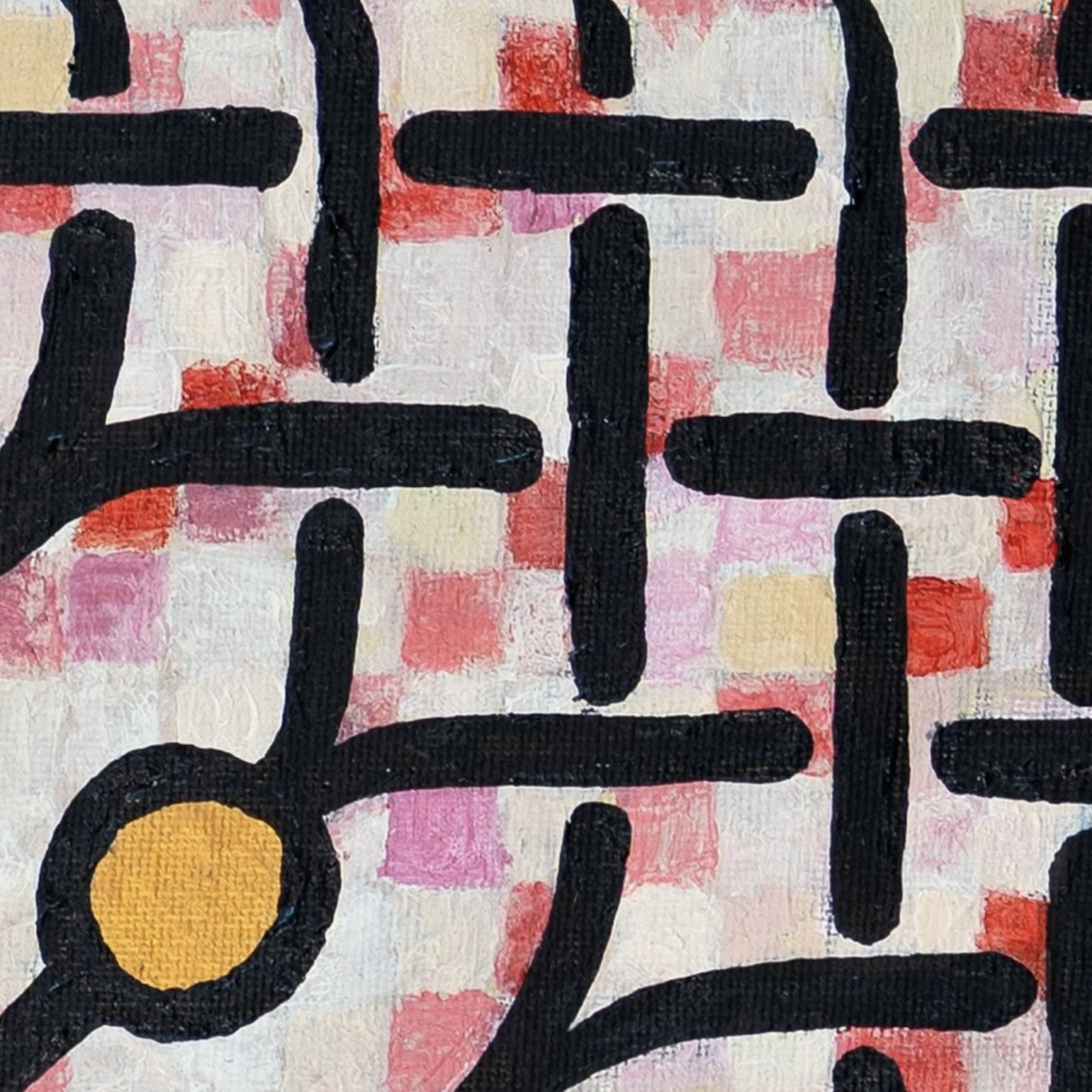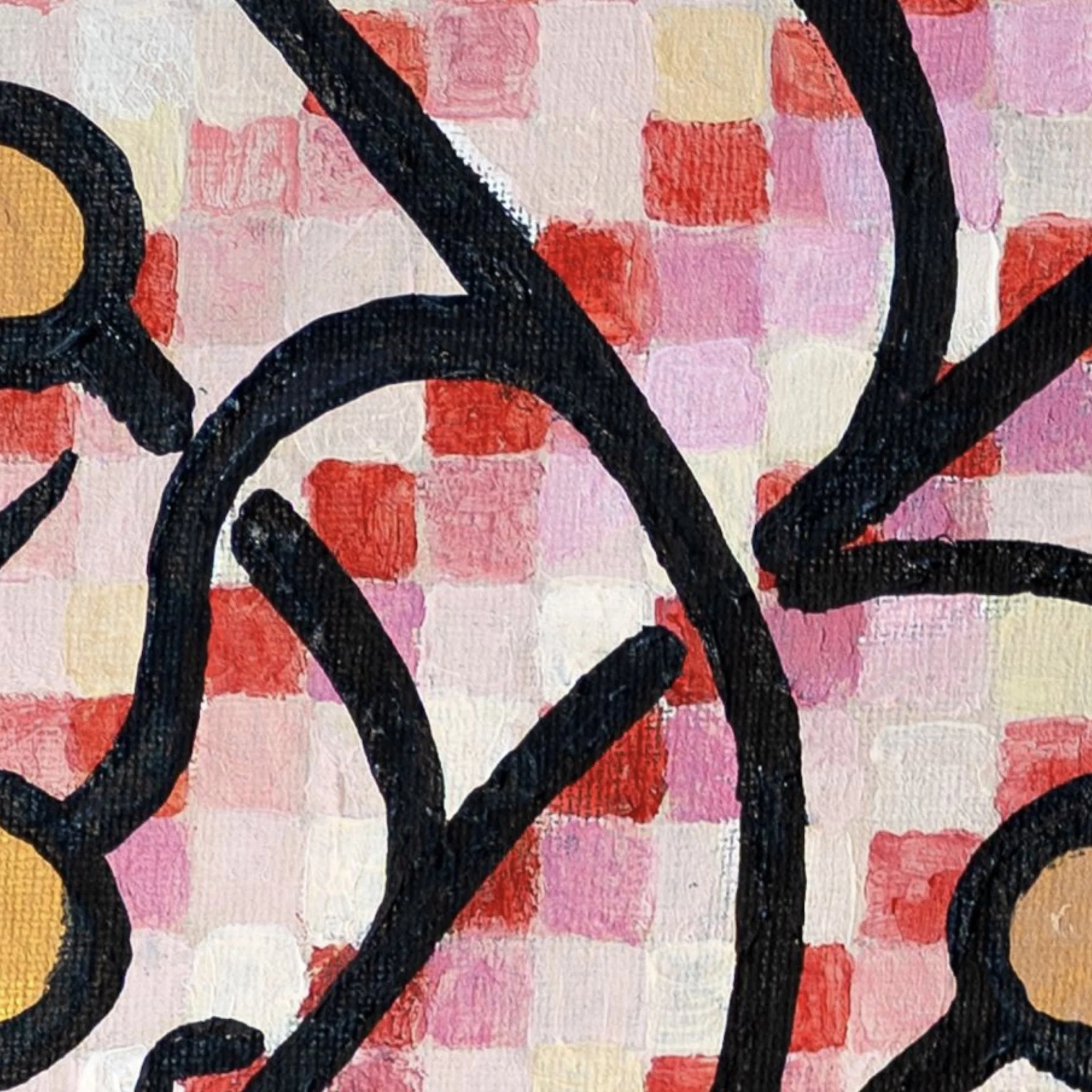 "Generations" presents one of Gil's most sophisticated explorations of pattern, color, and cultural memory. The composition features a central symmetrical structure reminiscent of traditional Kociewian textile designs, surrounded by more fluid, gestural elements that suggest the evolution and transformation of cultural forms over time. The vibrant palette of deep crimson and rose tones against subtle pinks creates a visual field that is simultaneously energetic and contemplative.